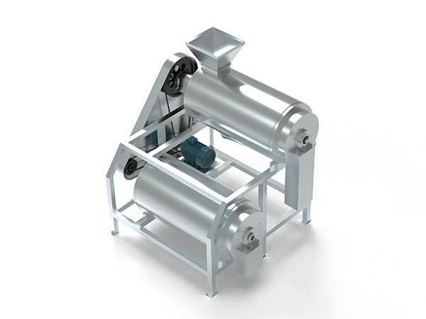 電機(jī)通過三角帶傳動(dòng),使安裝在花鍵軸上的刮板高速旋轉(zhuǎn),當(dāng)經(jīng)過破碎的水果通過進(jìn)料口進(jìn)入機(jī)內(nèi)時(shí),擋漿盤將物料均勻排發(fā)到刮板和篩網(wǎng)之間,由于刮板的回轉(zhuǎn)作用和導(dǎo)程角的存在,使物料沿著園筒向出口端移動(dòng),移動(dòng)的軌跡呈螺旋狀,物料就在刮板和篩網(wǎng)之間移動(dòng)過程中受離心力的作用而被擦碎,汁液和肉質(zhì)(已成漿狀)從篩孔通過進(jìn)入下道工序(雙道打漿機(jī)為聯(lián)動(dòng)重復(fù)上列過程),皮和籽等則從出渣斗排出,從而達(dá)到自動(dòng)分離的目的。只要變換不同規(guī)格的篩網(wǎng)以及調(diào)整刮板導(dǎo)程角的大小,可改變不同的打漿速度,獲滿意的效果。