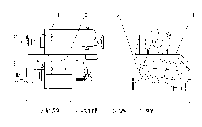 ★ 主要結(jié)構(gòu):傳動(dòng)系統(tǒng)、軸承座、套軸、筒后蓋、擋漿盤、筒身、花鍵軸、篩網(wǎng)、刮板(或打漿棒)、筒前蓋、機(jī)架等