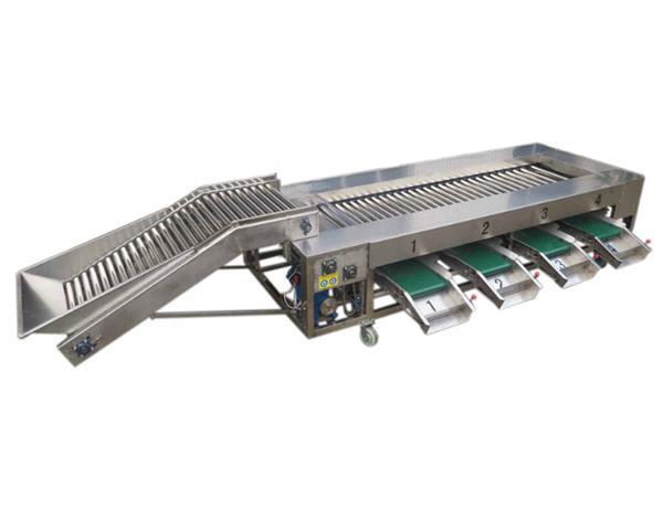 本設(shè)備是全不銹鋼果蔬分選機(jī)械,是由上果輸送機(jī)和滾杠式分選機(jī)組成;上果輸送機(jī)通過滾杠自動(dòng)旋轉(zhuǎn)來達(dá)到均勻上料,滾杠式分級(jí)機(jī)根據(jù)果蔬直徑大小來分選;