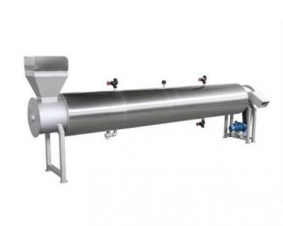 該機由機架、傳動電機、傳動罩殼、螺旋軸、進料斗、蒸汽加熱室、出料口等部件組成。工作時:無級調(diào)速電機經(jīng)過鏈條驅(qū)動螺旋軸旋轉(zhuǎn),蒸汽進入蒸汽加熱室后通過殼體表面?zhèn)鳠幔訜釟んw內(nèi)物料。物料從進料斗進入殼體后,轉(zhuǎn)動的輸送螺旋邊推進邊預(yù)煮, 后由料翻板將物料從出料口送出。該機無級調(diào)速,可連續(xù)作業(yè),適用多種果蔬及肉類加工。