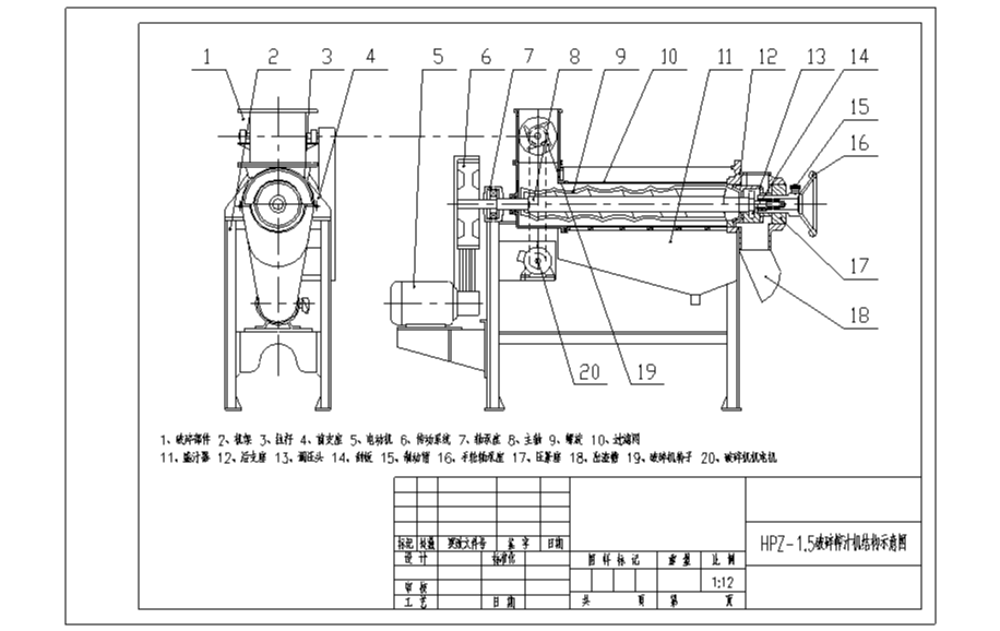 簡介—由前支座、進料斗、螺旋、過濾網、盛汁器、后支座、出渣槽等零件組成,螺旋主軸左端支承于滾動軸承座內,右端支承于手輪軸承座中,電動機通過一對三角皮帶輪驅動螺旋進行工作。
